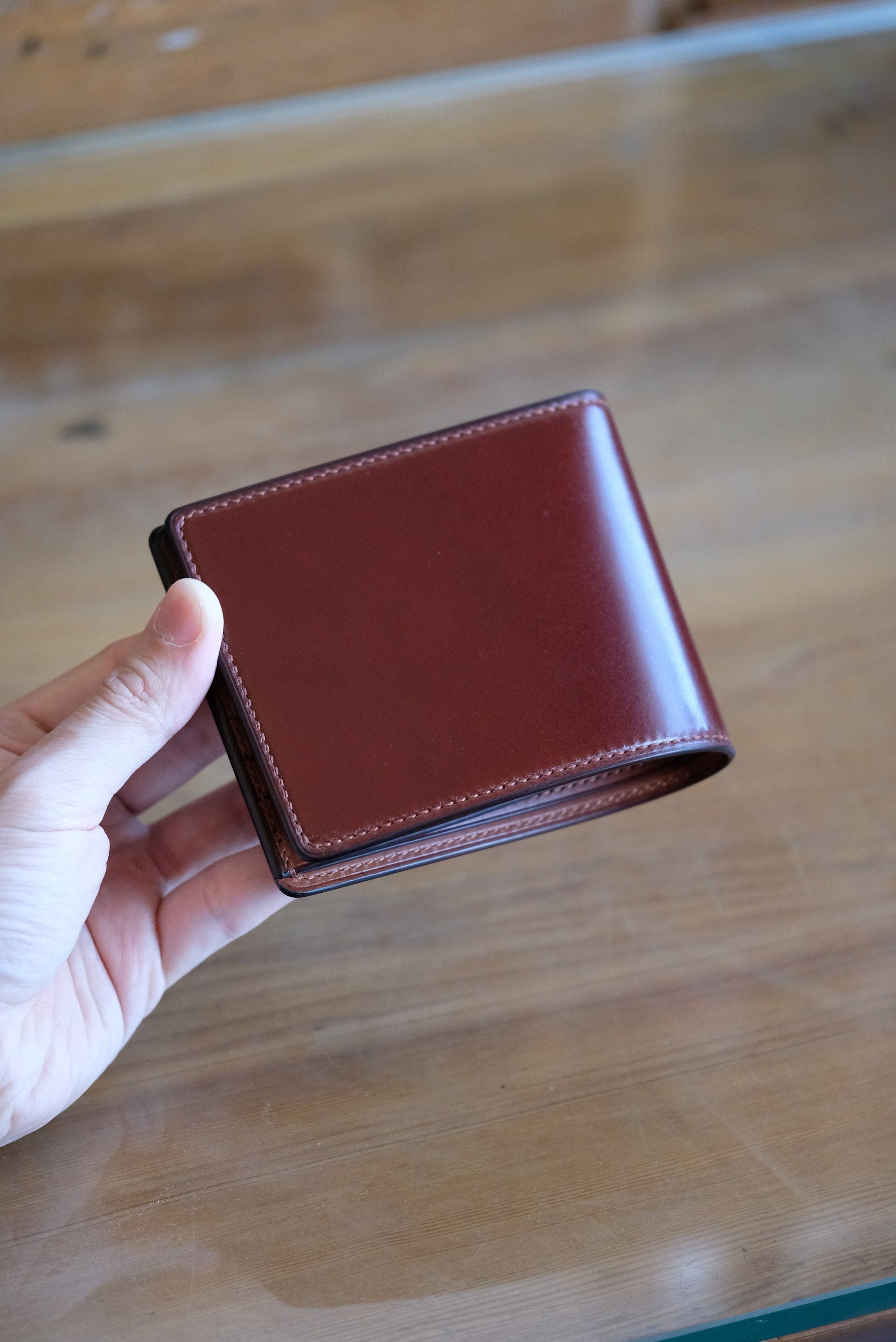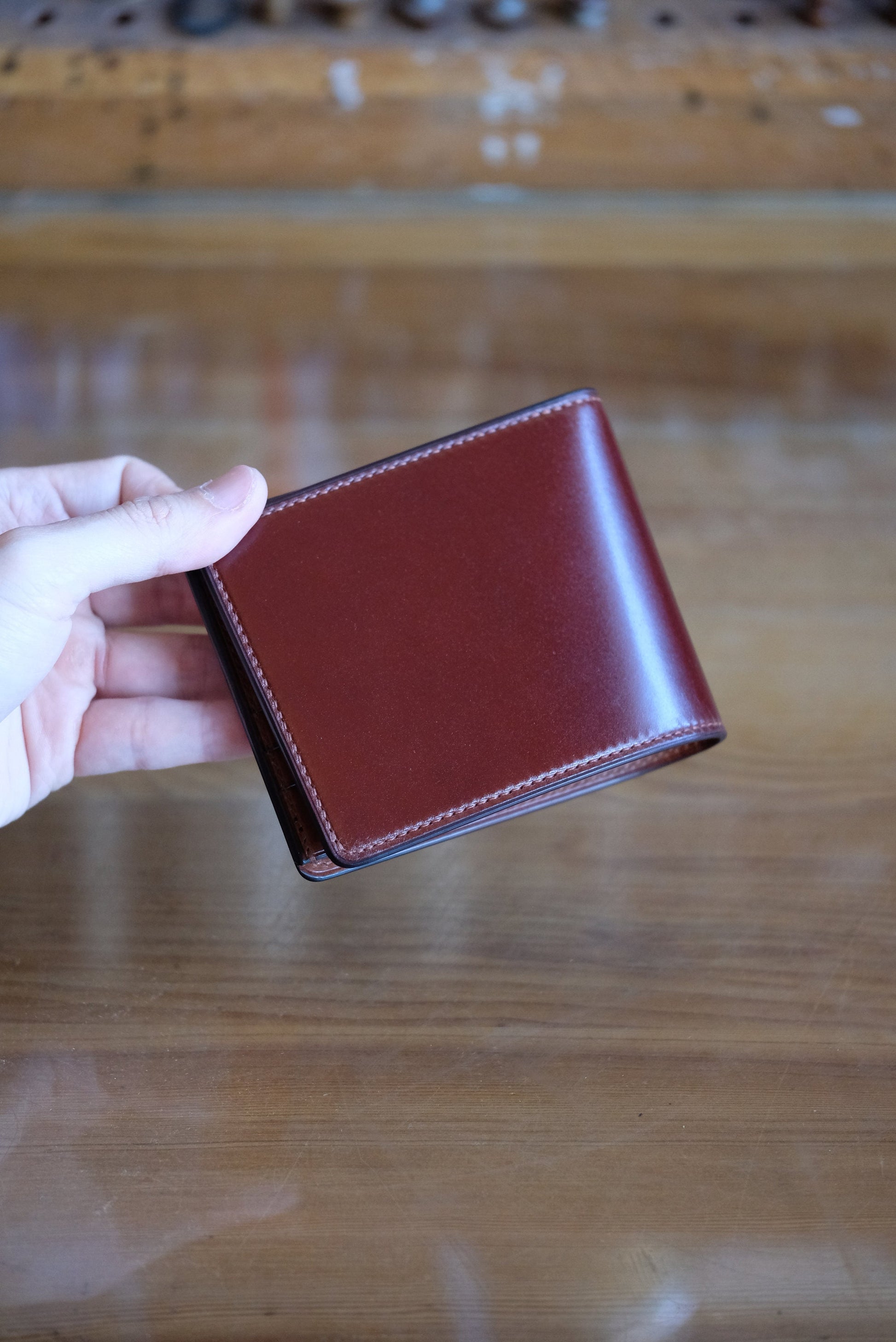 SW01 - Bifold Wallet - Japanese Shinki Hikaku shell cordovan - Burgundy / Camel / No.15 stitching / Made to Order